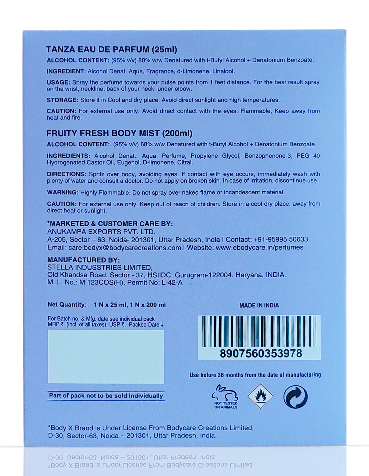 Sweet, bright, and impossible to ignore - the BodyX Tanza & Fruity Fresh Set is for women who walk into a room and instantly lift the mood. Tanza opens with juicy pear and red berries, blooms into gardenia and jasmine, and settles into a soft patchouli base. Fruity Fresh adds the playful side of life with plum, melon, freesia, and chamomile wrapped in musk and vanilla.