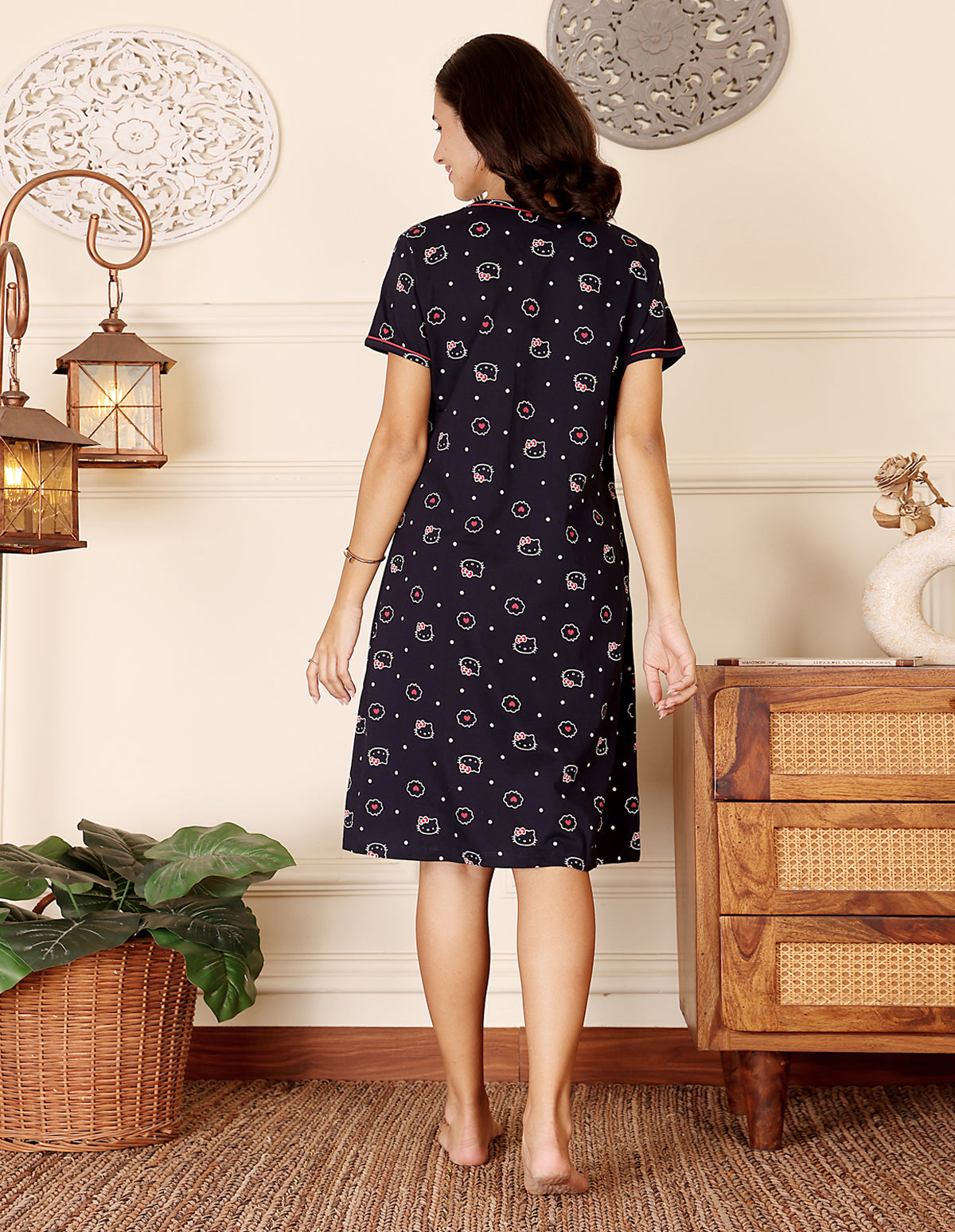 Unwind in style with this dark blue multi-colored long night dress by Bodycare. Crafted from a breathableCotton with combed cotton for added softness, it features a self-design and regular sleeves—perfect for a relaxing night in